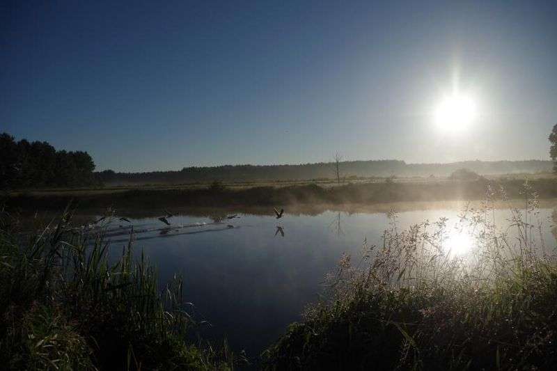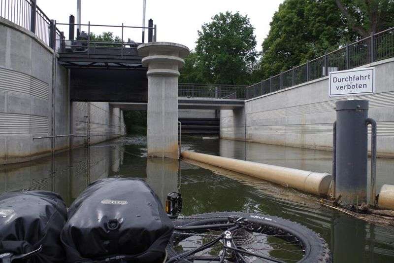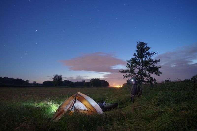 In der Nacht blieb es still, erst am nächsten Morgen, als die Sonne aufging und ihre wärmenden Strahlen auf das Zelt warf, bewegte sich der Wildschweintross wieder zurück in den Wald. Wenig später folgten die ersten Radtouristen auf dem Neißedamm. Mein Weg führte mich jedoch direkt auf dem Wasser des Grenzflusses weiter. Ich hatte zwei Schlauchboote dabei, die ich vor der nächsten großen Sommertour noch einmal ausgiebig testen und vergleichen wollte. Eigens dafür fuhr ich durch den Muskauer Faltenbogen zum Fürst-Pückler Park, setzte dort auf polnischer Seite das erste Boot ein und ließ mich zwei Tage die Neiße hinuntertreiben. Ein paar Stauwehre mit kleinen Elektrizitätswerken zwangen mich einige Male zum Aussteigen und Umtragen, dazwischen aber zeigte sich der Flusslauf unberührt mit naturbelassenen Ufern. Direkt am Fluss traf ich die ganze Zeit keinen Menschen. Entsprechend unzugänglich waren auch die Ufer, Mitte Juni schon so zugewachsen, dass ich am besagten Gewitterabend noch bis in die Nacht weiterpaddeln musste, ehe ich einen geeigneten Ausstieg fürs Nachtlager fand.