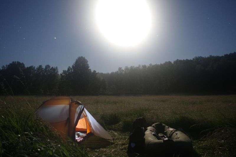 Es war ein ruhiger Abend, eine Ruhe wie nach einem Sturm. Alles war nass vom vorangegangenen Gewitterregen, doch jetzt war der Himmel klar und Nebelschwaden stiegen aus dem feuchten Gras empor. Der Mond stand hoch am Himmel und tauchte die Landschaft in ein fahles Licht. Ich trat mir eine Fläche in das hohe Gras und baute rasch mein Zelt auf, ehe sich die Feuchtigkeit auch auf meine Ausrüstung niederschlug. Plötzlich hörte ich ein Rascheln im Gras. Es näherte sich und kam direkt auf mich zu. Irgendwann sah ich die Halme wackeln, dann einen großen Schatten – ein Keiler! Als er mich endlich bemerkte, stand er schon direkt vor mir, sprang erschrocken auf und verschwand zum Glück wieder dahin, wo er her kam... Offenbar hatte ich mich direkt an seiner allabendlichen Revierrunde niedergelassen, denn es raschelte unweit meines Platzes weiter – eine ganze Wildschweinfamilie passierte mich nun in sicherer Distanz.