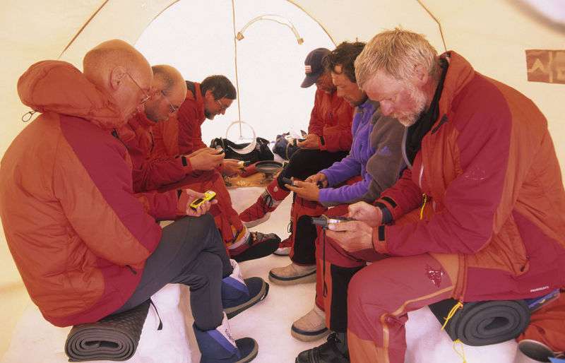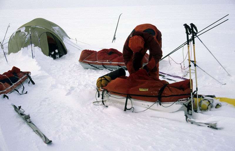 In order to see the changes in the glaciers, one has to make repeated measurements. Thus, the first repeat measurements began last summer. We had to achieve an average of 20 km per day, on skis and pulling our sleds behind us. The exact same route was taken with an identical time plan as in 2002. That might sound simple, but it is not! In 2002, the group covered the greatest distances possible. This year, the same distances had to be achieved each day, regardless of the weather and snow conditions. We only had a leeway of two to three days. The physical challenges were enormous, which resulted in a great psychological burden on the expedition group. We usually marched for eight hours a day. It was only somewhat less exhausting on the few days we sailed. We are proud to say that the goals of the expedition were more than fulfilled.