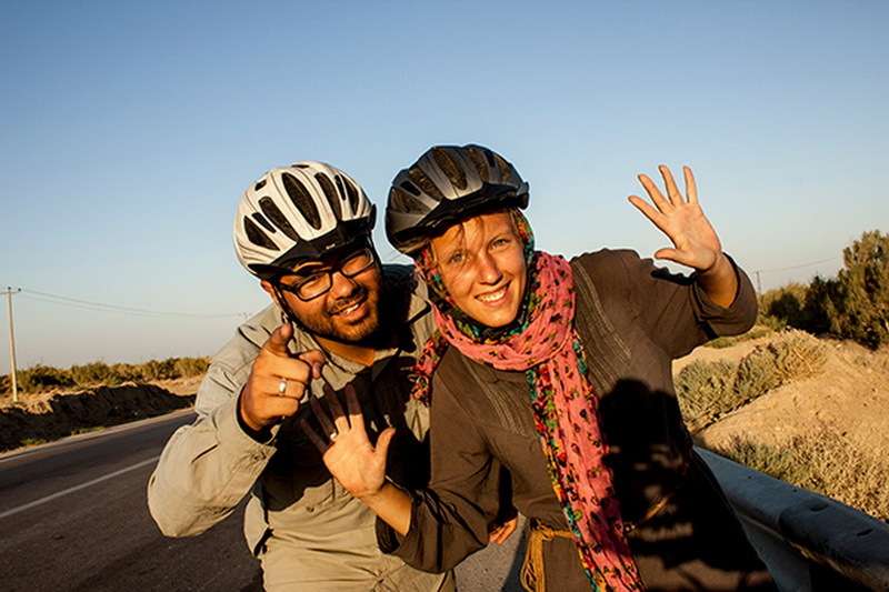 Wir, das sind Roberto Gallegos aus Mexiko und Annika Wachter aus Deutschland. Vom Radfahren hatten wir vor unserer Reise nicht den blassesten Schimmer, doch wir suchten nach einer günstigen Möglichkeit, uns langsam durch die Welt zu bewegen. Erst als wir schon eine Weile unterwegs waren, realisierten wir, dass wir dank unserer Räder immer wieder in kleinen Ortschaften Pause machen, in denen kein Touristenbus anhält. Wir sind auf die Hilfe der Einheimischen angewiesen, müssen regelmäßig nach Wasser, Essen, dem Weg und einem Zeltplatz fragen. Oft landen wir spontan auf den geernteten Feldern einer netten Bauernfamilie und werden sogleich gebeten, das Zelt stehen zu lassen und zum Abendessen mit ins Haus zu kommen. Egal ob Laos, der Iran, Serbien, Kirgisistan, China, die Türkei, Kambodscha oder Ungarn: die Menschen haben uns überall wie ihre geladenen Gäste behandelt. Dass wir meistens kaum ein Wort in ihrer Sprache sagen konnten, war Nebensache. Die Kinder, die sich anfangs noch schüchtern an die Beine ihrer Eltern klammern, spielen schon bald mit Isomatte, Schalthebel und unserem Zelt. Die Erwachsenen betrachten die Fotos vom Wattenmeer, Fachwerkhäusern, Schneewehen im Garten, unseren beiden Familien, sowie Wasserfällen, dem Dschungel und Mayaruinen in Mexiko. Oft kochen wir gemeinsam oder steuern etwas Obst als Nachtisch hinzu, bevor wir ins Zelt kriechen.